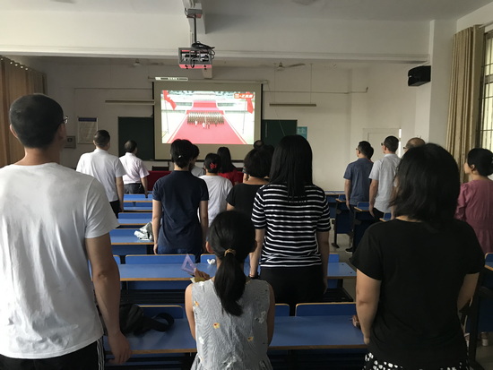 8时整,在学院党委、行政班子带领下,全体教师员工在隆隆的炮声中,肃立升国旗唱国歌。聆听了中共中央总书记、国家主席、中央军委主席习近平发表重要讲话。在学院教职工中引起强烈反响。