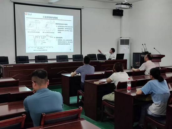 王林博士做了《改性聚对苯二甲酰间苯二胺纤维的制备及其结构性能研究》的学术报告。介绍聚合物耐热纤维在我国大气污染的防治中的重要作用,并结合我国耐热聚合物纤维产业发展状况,报告了改性聚对苯二甲酰间苯二胺纤维的研究开发历程。同时,结合自身的企业工作经历,与在座老师就科研成果转化、企业横向项目合作等问题进行了探讨交流。