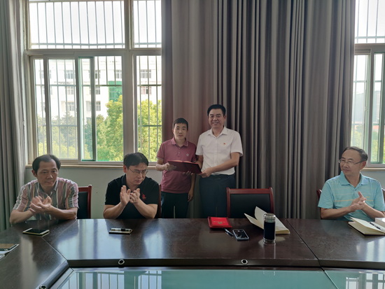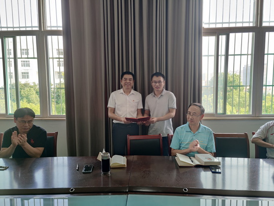 接着开展党员政治生日活动。活动共分四项:一是华琼新博士诵读钱学森、钱三强、师昌绪等9位院士入党申请书节选内容;二是学院党委书记袁传发同志向2021年度优秀党员(余健、张义福)颁发证书,优秀党员交流发言;三是向支部党员赠送《共产党宣言》和谈心谈话记录本;四是支部全体党员进行入党宣誓。