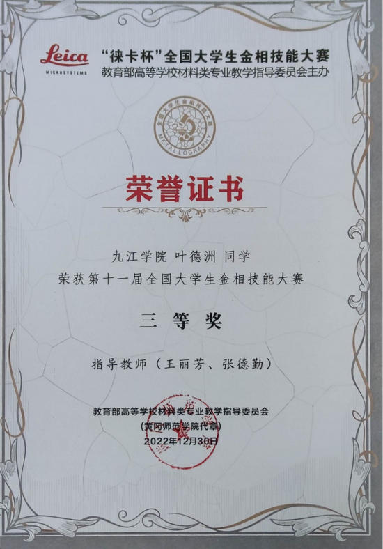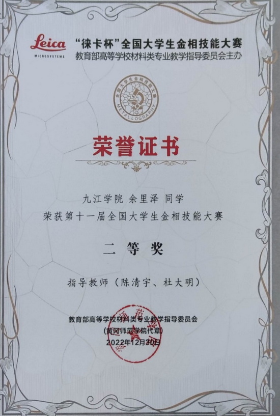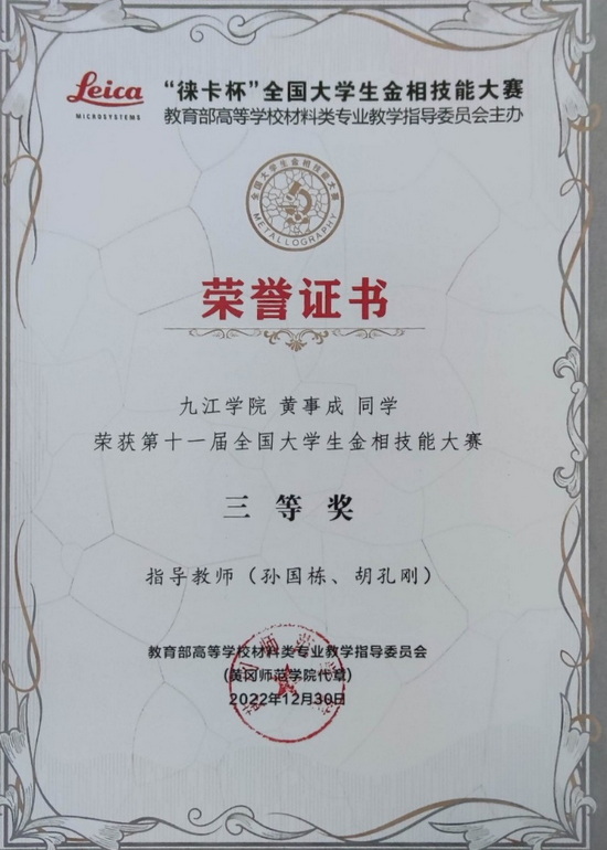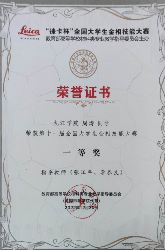 近日,由教育部高等学校材料类专业教学指导委员会主办、黄冈师范学院承办的第十一届全国大学生金相技能大赛落幕,共有来自清华大学、吉林大学、四川大学、武汉大学等414所高校的3700余名在校大学生参加了复赛和决赛阶段的比赛。我校WilliamHill官方周涛同学荣获个人一等奖,余里泽同学荣获个人二等奖,叶德洲、黄事成同学荣获个人三等奖。