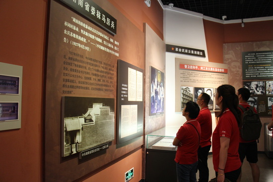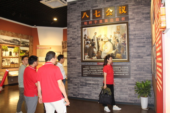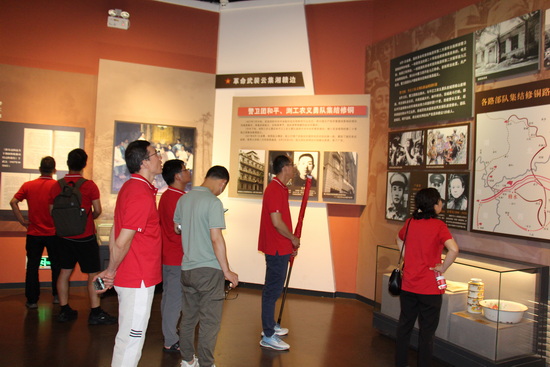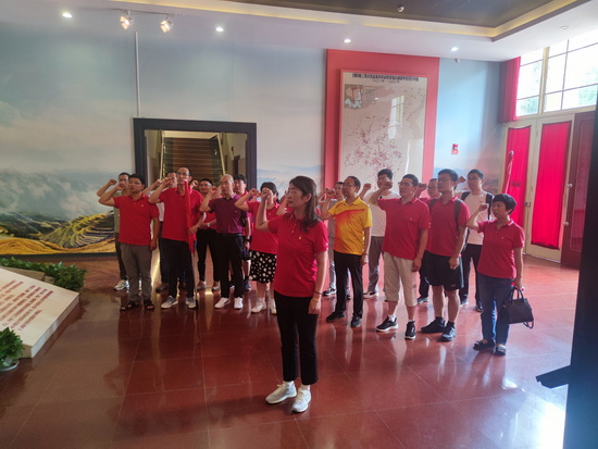 在秋收起义纪念馆大厅鲜红的党旗面前,全体党员重温入党誓词,表达不忘入党初心、永葆党员本色,为党的事业奋斗终生的决心。