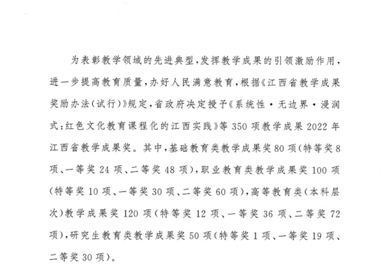 江西省教学成果奖2022年增设为江西省人民政府表彰常设项目,由江西省人民政府主办,江西省教育厅承办,分高等教育、职业教育、基础教育、研究生教育四个类别,每四年评选一次,共设350个奖项,其中高等教育类120项、职业教育100项、基础教育类80项、研究生教育类50项。
