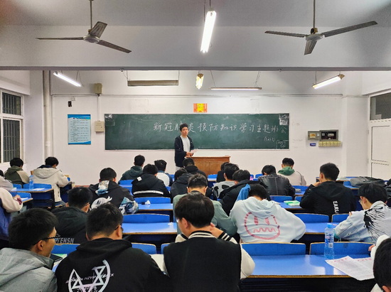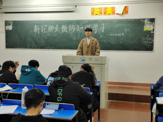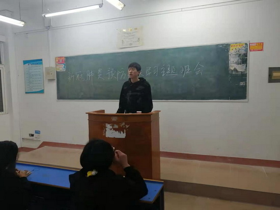 在班会上,班长带领同学们重温了新冠肺炎的有关知识,重点讲述了学生在校如何做好自我防护,提醒学生一定要注意个人卫生,随时关注自己的健康状况,勤洗手、勤通风、戴口罩;强调学生尽量减少出行、聚会、聚餐等活动,出入校园严格遵守报备、请假等疫情防控制度;呼吁大家:疫情就是命令,防控就是责任。