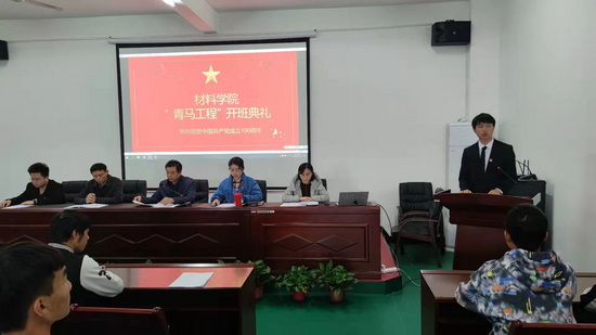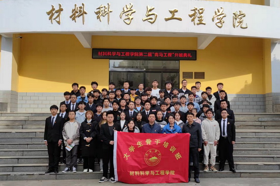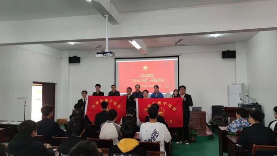 在激昂的团歌声中,学院党委书记袁传发代表院党委向学生代表进行授旗,学生代表以庄严昂扬的姿态接过材料学院骨干培训班的班旗。