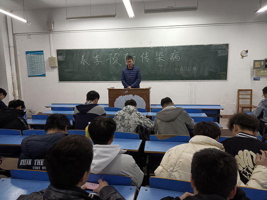 班会上,主持人向同学们介绍春季常见传染病的传染途径及预防方法等知识,对几大春季传染病的传播途径、发病症状以及预防措施进行了详细讲解,并用生动的案例使同学们认识到了学校是人员密集场所,同学们应尤其注意预防。最后,主持人向同学们强调,预防春季传染病不仅需要做好自我防护,还要加强体育锻炼,增强身体素质。班会过程中气氛活跃,同学们纷纷表示要积极锻炼身体,预防传染病。