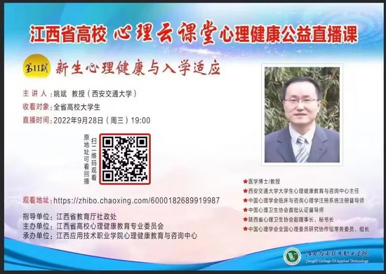 为针对性做好当前背景下大学生心理关怀,关注学生身心健康,28日晚七点,我校组织观看了江西省高校心理云课堂心理健康公益直播课。此次公益直播课主题为“新生心理健康与入学适应”。课上,西安交通大学心理中心主任姚斌教授围绕新生入学心理状态,交际心理出现的问题以及提出相应建议展开阐述。课程对缓解同学们来自在新学校的心理烦恼、树立健康阳光的心态提供帮助。