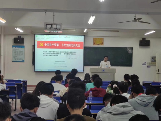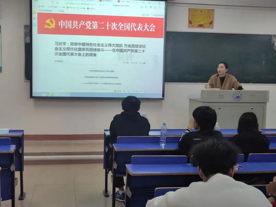 思政科欧阳效卓老师领学了习近平总书记在党的二十次开幕式上作的《高举中国特色社会主义伟大旗帜 为全面建设社会主义现代化国家而团结奋斗》报告精神。欧阳老师指出,十年来,我们经历了对党和人民事业具有重大现实意义和深远历史意义的三件大事:一是迎来中国共产党成立一百周年,二是中国特色社会主义进入新时代,三是完成脱贫攻坚、全面建成小康社会的历史任务,实现第一个百年奋斗目标。这是中国共产党和中国人民团结奋斗赢得的历史性胜利,是彪炳中华民族发展史册的历史性胜利,也是对世界具有深远影响的历史性胜利。她进一步指出,我们要清楚认识到我国发展面临新的战略机遇,全面建设社会主义现代化国家,是一项伟大而艰巨的事业,前途光明,任重道远;当前,世界百年未有之大变局加速演进,新一轮科技革命和产业变革深入发展,国际力量对比深刻调整;党和国家对我们青年寄予殷切的希望,青年强,则国家强;我们青年大学生生逢其时,施展才干的舞台无比广阔,实现梦想的前景无比光明。接着,欧阳老师向大家提出要求,作为新时代的青年学子,在对中国共产党团结带领全国各族人民取得完成第一个百年奋斗目标伟大成就而感到骄傲自豪的同时,更应认识到自己在第二个百年目标实现的过程中所肩负的历史使命;广大青年学子要坚定不移听党话、跟党走,怀抱梦想又脚踏实地,敢想敢为又善作善成,立志做有理想、敢担当、能吃苦、肯奋斗的新时代好青年,让青春在全面建设社会主义现代化国家、在全面推进中华民族伟大复兴的火热实践中绽放绚丽之花。