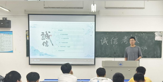 接下来,班主任向大家强调学校的考试纪律。他结合某些学生考试舞弊的反面案例,为同学们敲响警钟,让同学们认识到违反考试纪律的危害,了解诚信考试的重要性。并进一步阐述了严肃考风考纪,是树立和养成良好学风的一项重要内容,在人生成长的大学阶段,大家对考试要认真对待,诚实答卷,树道德之新风,立诚信之根基。