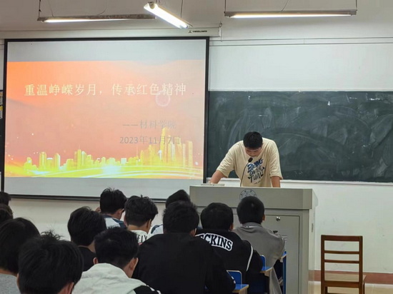 为深刻把握红色精神的时代内涵,将红色文化与教育教学深度融合,持续推动红色文化润心育人,红色精神薪火相传,引导学生汲取红色精神的强大力量,成长为堪当时代大用的新青年。2023年11月7日,WilliamHill官方于竞知楼204举行了“天生我材”读书汇系列活动之红色文化主题活动。本次活动由材料学院A2311、A2312班级班长主持,全体同学踊跃参与。