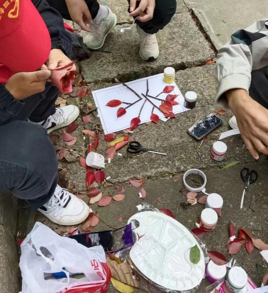 首先,志愿者们携带工具在校园内开展落叶收集行动。他们仔细寻找各式的落叶、枯枝以及小草,力求收集到的每一片叶子都能为后续的创作增添独特的魅力。经过队员们的一番努力,收集好的落叶被统一放置,为后续手工制作环节做准备。