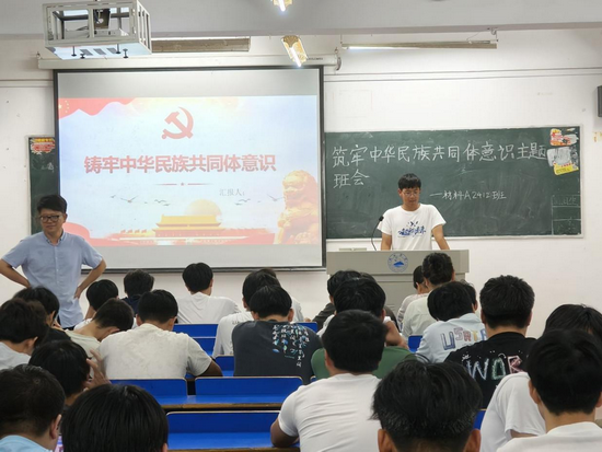 活动中,各班班长强调,铸牢中华民族共同体意识是新时代党的民族工作主线,更是国家统一之基、民族团结之本、精神力量之魂。他们以“中华民族一家亲、同心共筑中国梦”为核心内容开展宣讲,既结合古代丝绸之路各民族商贸文化交融的历史片段,也援引新时代脱贫攻坚中各族群众携手共进的案例,清晰呈现这一意识的历史渊源与时代实践。同时,他们还向同学们进行了深入解读:它不仅是对“你中有我、我中有你”民族关系的直观认知,更是植根于共同疆域、共同文化、共同奋斗历程的精神凝聚,是引领各族人民同心奔赴民族复兴的思想根基,引导同学们从知晓案例到领悟内核,逐步树立正确民族观、历史观。