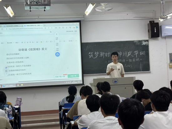 各班班长首先带领同学们简要回顾了新中国成立以来的辉煌发展历程,从站起来、富起来到强起来的历史性跨越,让同学们深刻感受祖国发展的磅礴力量;随后,详细介绍了本次活动的 “红色诗歌朗诵”“爱国影片欣赏与分享” 两大环节流程,引导同学们厚植爱国情怀,传承红色基因。