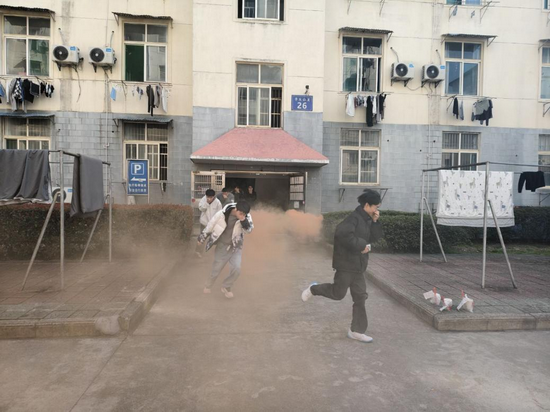 演练前期,26栋消防逃生演习按预定计划准时启动。随着警报声响起,各班级师生在工作人员引导下,严格按照消防逃生路线,弯腰捂鼻、低姿行进,紧张有序地快速撤离至指定安全区域。撤离过程中,师生动作规范、衔接顺畅,有效模拟了火灾突发时的紧急避险场景,切实提升了大家的应急反应速度与协同配合能力。与此同时,工作人员全程跟进,对撤离路线、人员集合等情况进行细致把控,确保演习安全、高效推进。