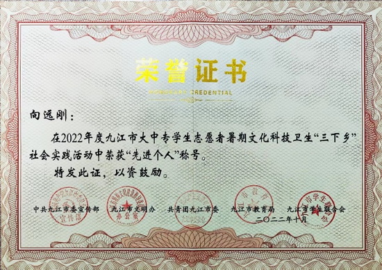 在社会实践中,无私奉献,提高人生阅历。他多次作为志愿者参与各项公益事业,疫情期间,利用寒暑假时间回到家乡做防疫志愿者,目前志愿服务时长达50小时。带队参加材料学院暑期“三下乡”社会实践活动,并取得“先进个人”称号。“感召时代使命,锻造青春底色——三下乡社会实践活动纪实”被“新华社”、“人民日报”、“学习强国”等多家主流媒体相继报道。