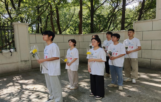 活动第一站,松柏之下,实践队拾级而上,来到景德镇英雄纪念碑前,缅怀革命先烈。国歌奏起,我们脑海里闪现一幕幕,无数英雄前仆后继、浴血奋战为抗战而牺牲的画面。随后,实践队在纪念碑前敬献鲜花,列队肃立默哀。缅怀仪式的最后,实践队依次环绕瞻仰英雄纪念碑,庄严的烈士纪念碑威严耸立,“为国牺牲永垂不朽”八个刚劲有力的鎏金大字金光闪闪、熠熠生辉。此刻,同学们无不红色血脉翻涌,坚信红旗自有后人擎,吾辈当自强。
