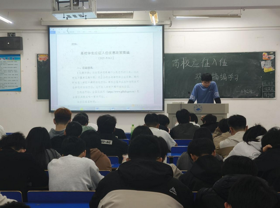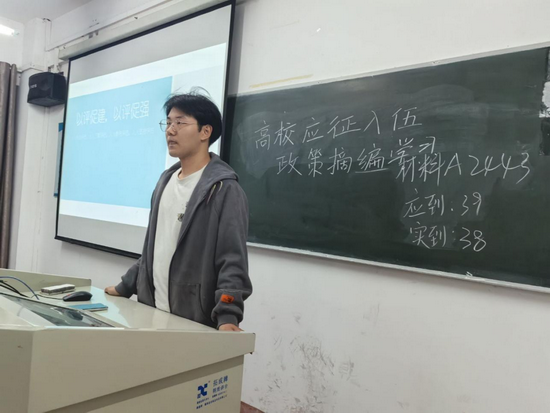 随后,会议结合《应征入伍政策摘编》,系统解读了报名条件及相关政策。内容涵盖年龄、学历、身体要求等基本条件,并详细介绍了“优先征集”“学费资助”“考研加分”“就业优待”等多项优惠政策。此外,会议还梳理了入伍流程,从报名到正式入伍的时间节点及注意事项均逐一说明,确保学生清晰掌握各环节要求。