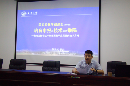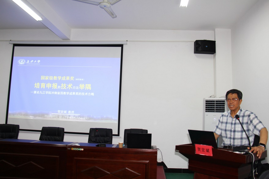 贺宏斌结合典型案例从高等教育教学成果奖申报的背景学理、制度导向、特色举隅等方面,围绕教学成果奖项目选题、高水平团队组建、项目成果特色凝练、申报材料撰写等方面作了详尽讲解。他还根据历届国家级教学成果奖获奖项目数据分析和当前高等教育教学改革热点,以及江西省教学成果奖青年培育项目等对我校教学成果奖培育进行了具有针对性和可操作性的指导。