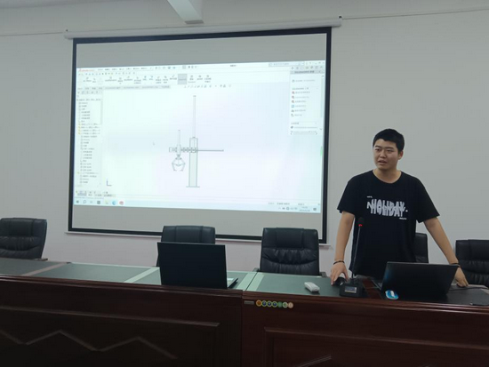 本次答辩按照项目分组顺序进行,《机械臂》设计组组长张启明、《上料机》1组组长阮凯、《上料机》2组组长肖铭建、《上料机》3组组长范坚强、《排索机构》组组长李海峰、付宇靖、《齿轮系》组组长刘涛鑫、《曲柄》组组长黄书飞、《刹车机构》组组长黄波等8位同学以ppt汇报、三维造型和图纸展示等不同方式向现场的老师和同学们进行了展示和讲解。