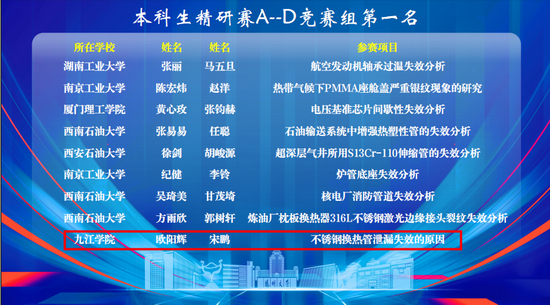 在材料学院领导重视和支持下,指导教师通过精选材料失效案例,选定不锈钢换热管泄漏失效的案例对学生进行精准指导。我院参赛学子认真准备,秉持细致入微和坚持不懈的钻研精神,查阅大量材料失效分析文献,运用学到的专业知识对失效案例进行了准确的分析和详细的解读,并对防止不锈钢换热管的泄漏失效提出了具有借鉴意义的措施和建议,获得评委的一致好评,通过初赛并顺利进入决赛,最终取得大赛第一名的好成绩。